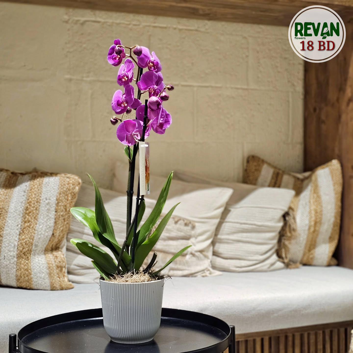 The Purple Phalaenopsis Lazio Orchid is a symbol of elegance and purity, featuring pristine white petals with a delicate golden center. Its gracefully arching stems and long-lasting blooms create a sophisticated and serene ambiance. Easy to care for, this orchid is perfect for bringing timeless beauty to any space.