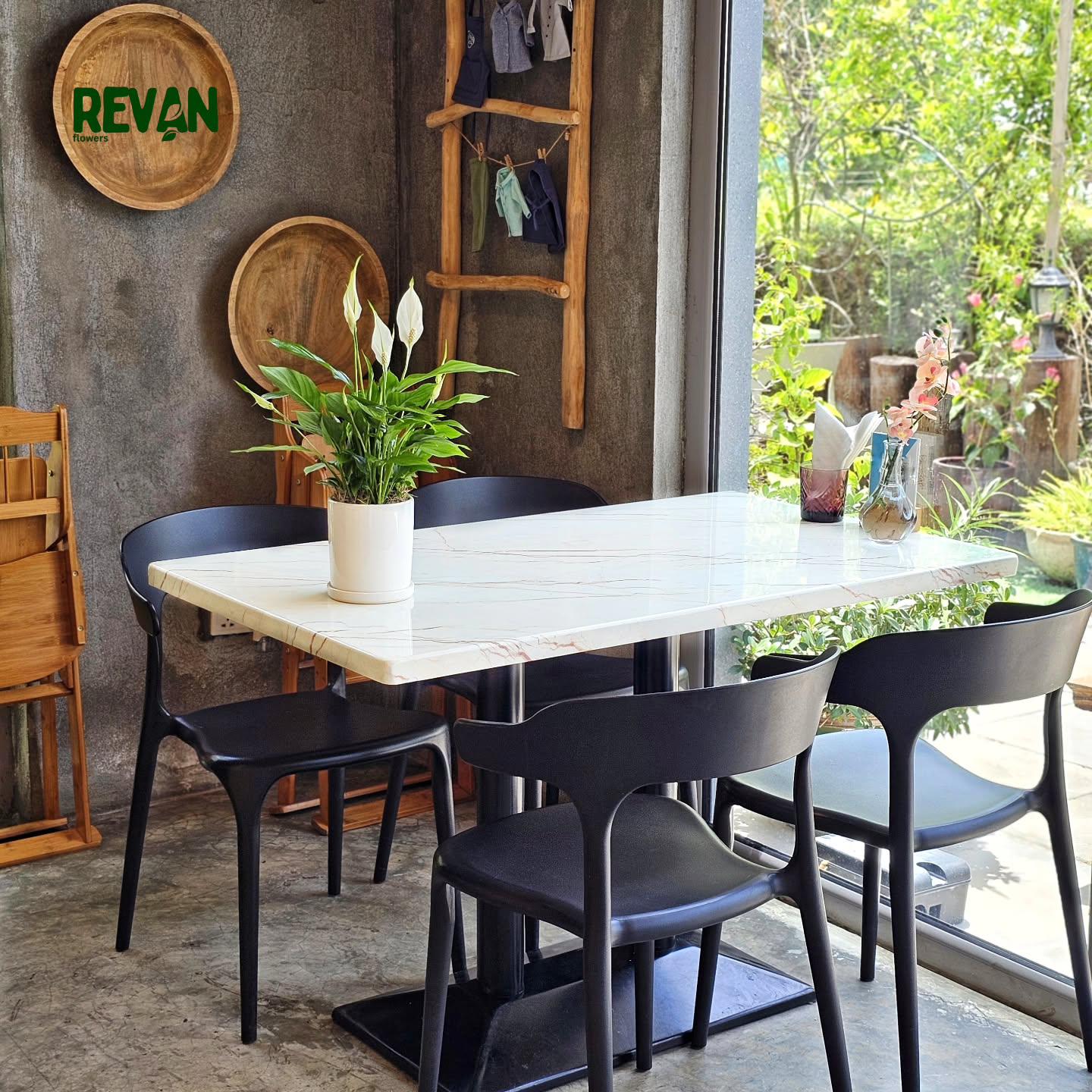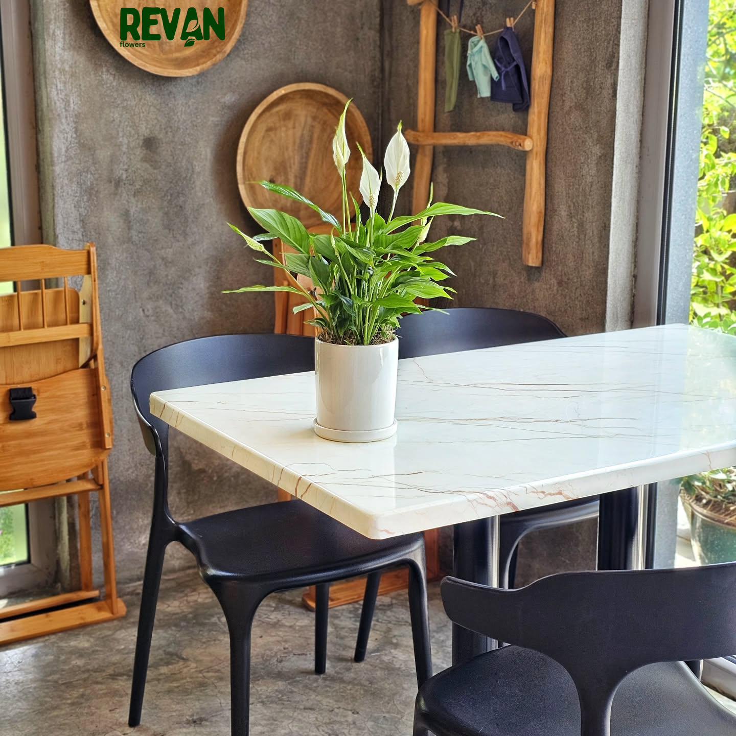 The graceful Spathiphyllum plant, known as the peace lily, captivates with its lush green leaves and calming aesthetic. Planted in a stylish ceramic pot, this arrangement adds a soothing charm to any interior space.